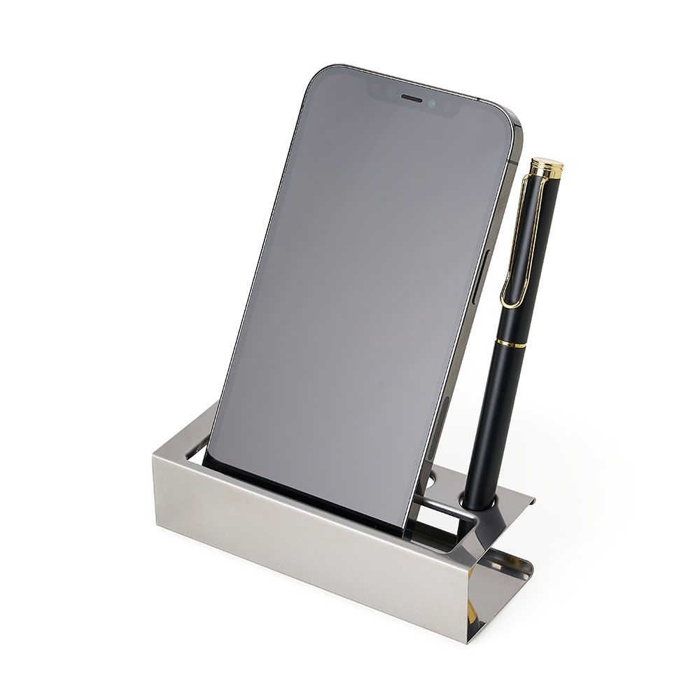 Porta cartão e porta canetas de mesa em inox espelhado.
