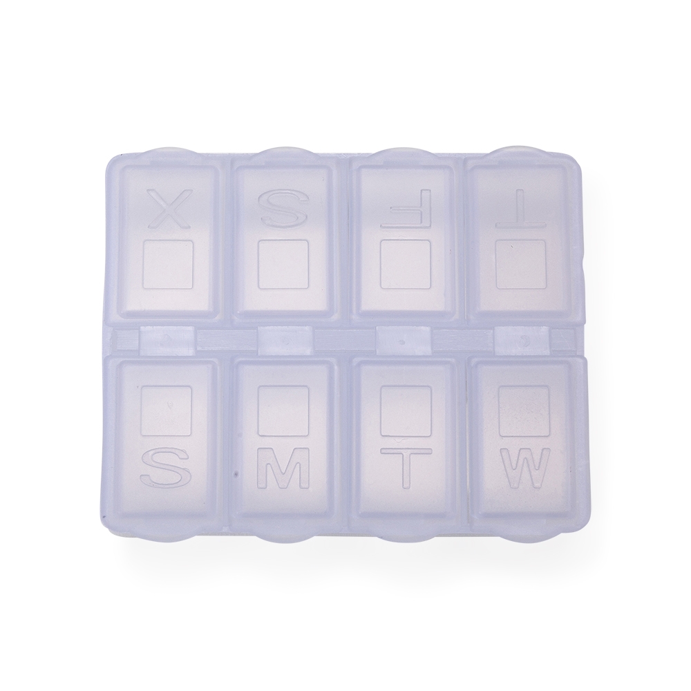Porta comprimido semanal em material plástico. Cada divisória contém a letra inicial referente o dia da semana(em inglês), possui oito divisões sendo a última para comprimido extra.