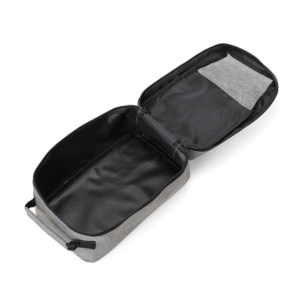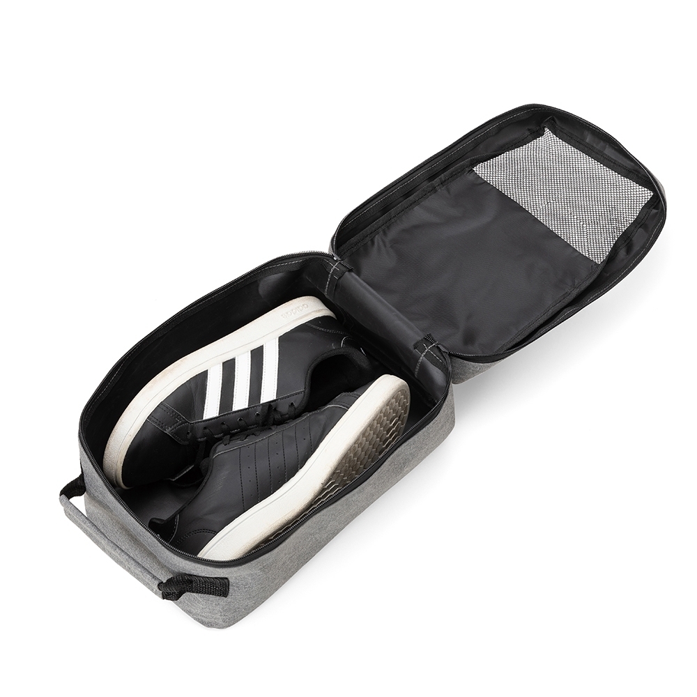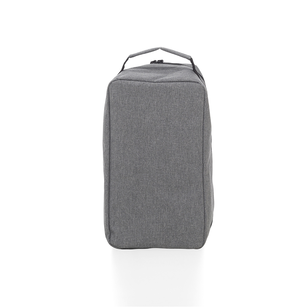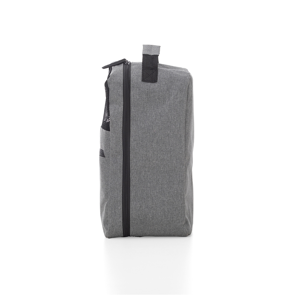 Porta tênis em poliéster. Possui bolso frontal com zíper, detalhe telado na parte frontal e alça de mão em nylon.