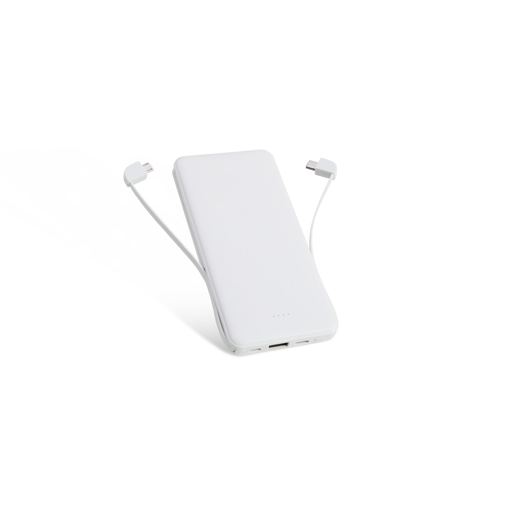 Power bank plástico de 10.000mAh com indicadores led de bateria e cabos acoplados: Tipo-C e V8. Acompanha cabo USB V8 e adaptador Lightning.