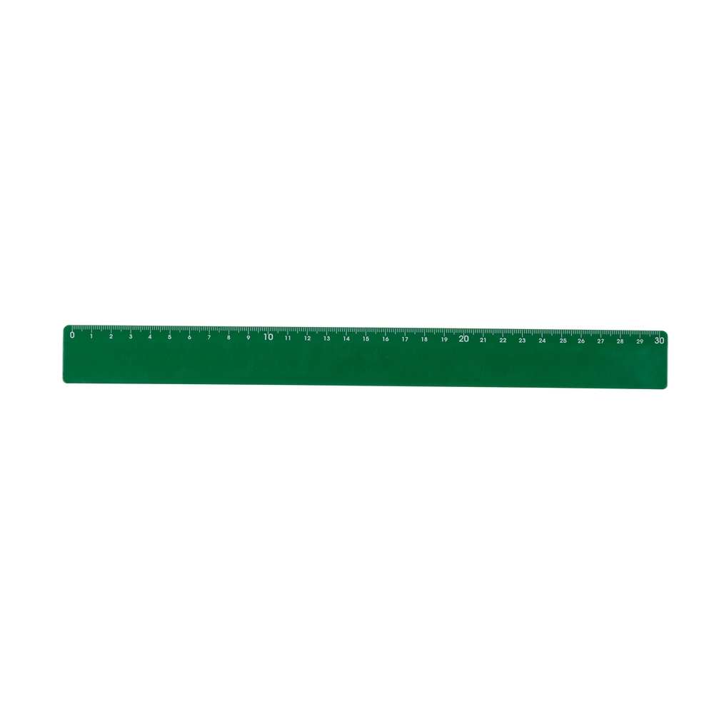 Régua plástica colorida de 30 cm com verso liso, apenas na cor branca possui detalhe em relevo no verso.