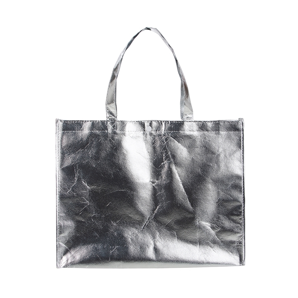Sacola TNT metalizada com botão. Confeccionado em TNT com revestimento plástico laminado, parte superior possui botão plástico para fecho.
